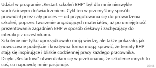 Wspieram osoby odpowiedzialne za szkolenia BHP w projektowaniu i układaniu procesów, które zmieniają decyzje ludzi w codziennej pracy i realnie wzmacniają kulturę bezpieczeństwa.